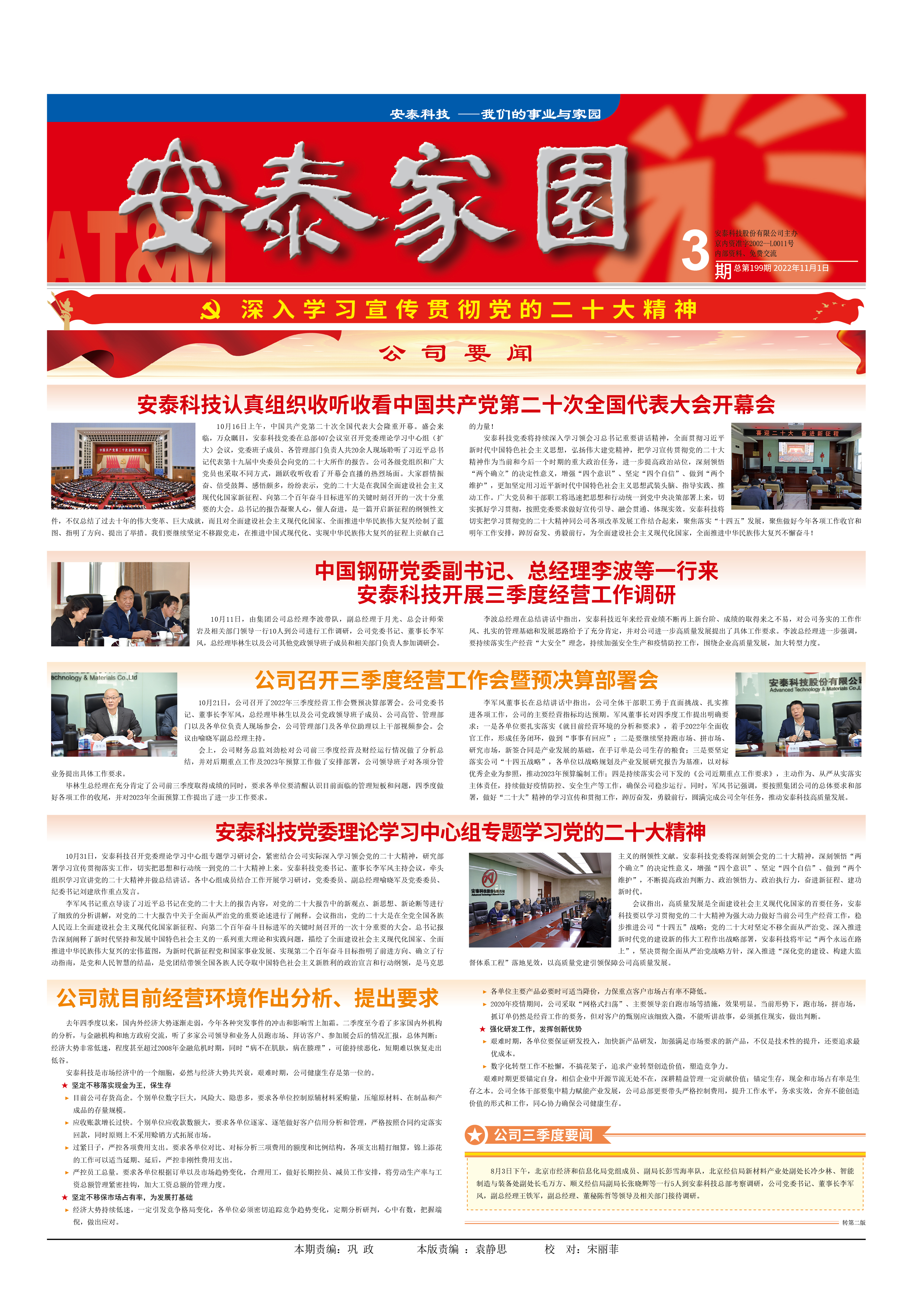 安泰科技黨委將持續(xù)深入學(xué)習(xí)領(lǐng)會(huì)習(xí)總書記重要講話精神,全面貫徹習(xí)近平新時(shí)代中國(guó)特色社會(huì)主義思想,弘揚(yáng)偉大建黨精神,把學(xué)習(xí)宣傳貫徹黨的二十大精神作為當(dāng)前和今后一個(gè)時(shí)期的重大政治任務(wù),進(jìn)一步提高政治站位,深刻領(lǐng)悟“兩個(gè)確立”的決定性意義,增強(qiáng)“四個(gè)意識(shí)”、堅(jiān)定“四個(gè)自信”、做到“兩個(gè)維護(hù)”,更加堅(jiān)定用習(xí)近平新時(shí)代中國(guó)特色社會(huì)主義思想武裝頭腦、指導(dǎo)實(shí)踐、推動(dòng)工作。廣大黨員和干部職工將迅速把思想和行動(dòng)統(tǒng)一到黨中央決策部署上來,切實(shí)抓好學(xué)習(xí)貫徹,按照黨委要求做好宣傳引導(dǎo)、融會(huì)貫通、體現(xiàn)實(shí)效。安泰科技將切實(shí)把學(xué)習(xí)貫徹黨的二十大精神同公司各項(xiàng)改革發(fā)展工作結(jié)合起來,聚焦落實(shí)“十四五”發(fā)展,聚焦做好今年各項(xiàng)工作收官和明年工作安排,踔厲奮發(fā)、勇毅前行,為全面建設(shè)社會(huì)主義現(xiàn)代化國(guó)家,全面推進(jìn)中華民族偉大復(fù)興不懈奮斗!
