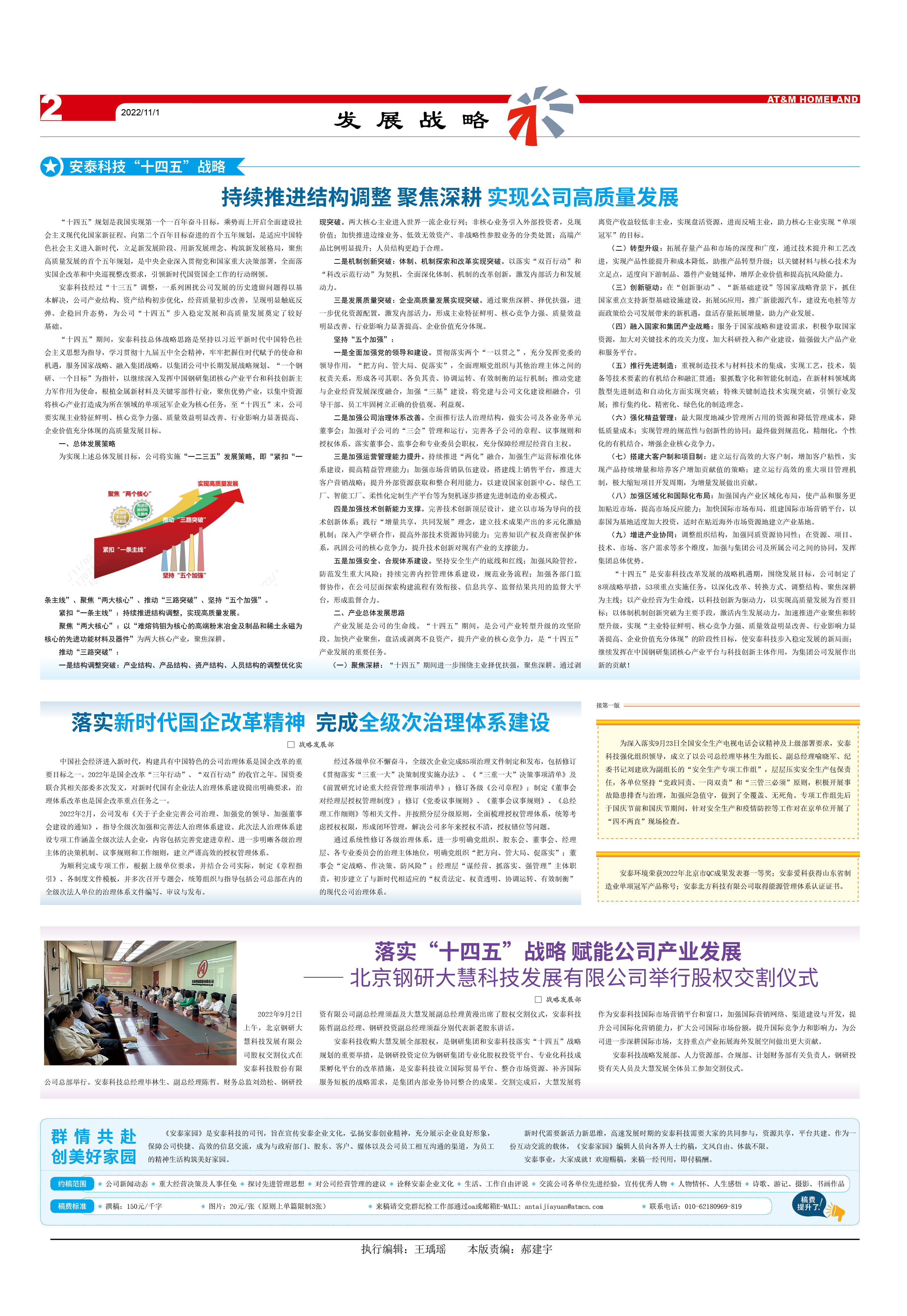 “十四五”是安泰科技改革發(fā)展的戰(zhàn)略機(jī)遇期,圍繞發(fā)展目標(biāo),公司制定了8項(xiàng)戰(zhàn)略舉措,53項(xiàng)重點(diǎn)實(shí)施任務(wù),以深化改革、轉(zhuǎn)換方式、調(diào)整結(jié)構(gòu)、聚焦深耕為主線;以產(chǎn)業(yè)經(jīng)營(yíng)為生命線,以科技創(chuàng)新為驅(qū)動(dòng)力,以實(shí)現(xiàn)高質(zhì)量發(fā)展為首要目標(biāo);以體制機(jī)制創(chuàng)新突破為主要手段,激活內(nèi)生發(fā)展動(dòng)力,加速推進(jìn)產(chǎn)業(yè)聚焦和轉(zhuǎn)型升級(jí),實(shí)現(xiàn)“主業(yè)特征鮮明、核心競(jìng)爭(zhēng)力強(qiáng)、質(zhì)量效益明顯改善、行業(yè)影響力顯著提高、企業(yè)價(jià)值充分體現(xiàn)”的階段性目標(biāo),使安泰科技步入穩(wěn)定發(fā)展的新局面;繼續(xù)發(fā)揮在中國(guó)鋼研集團(tuán)核心產(chǎn)業(yè)平臺(tái)與科技創(chuàng)新主體作用,為集團(tuán)公司發(fā)展作出新的貢獻(xiàn)!