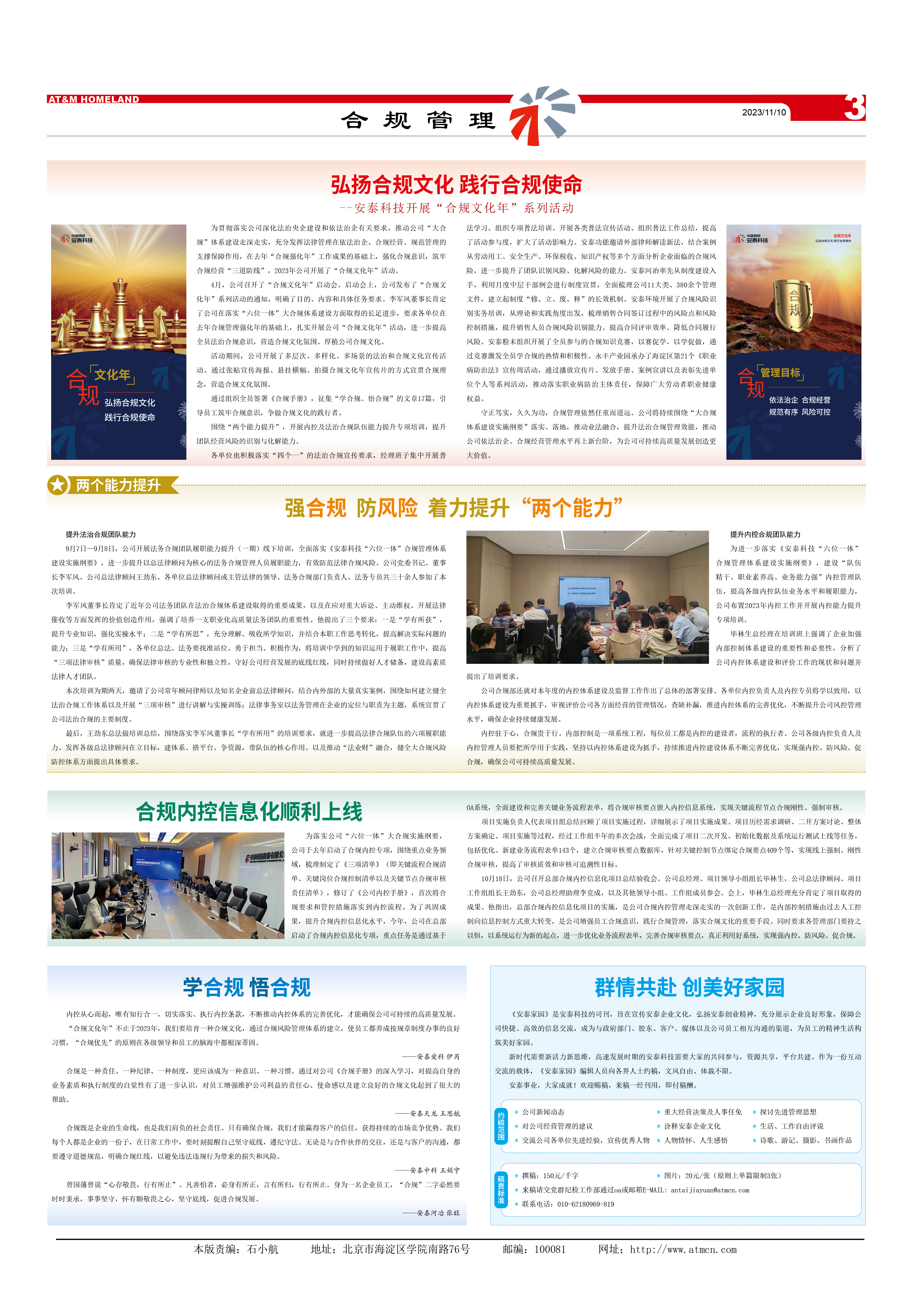 通過組織全員簽署《合規(guī)手冊》,征集“學(xué)合規(guī)、悟合規(guī)”的文章17篇,引導(dǎo)員工筑牢合規(guī)意識,爭做合規(guī)文化的踐行者。